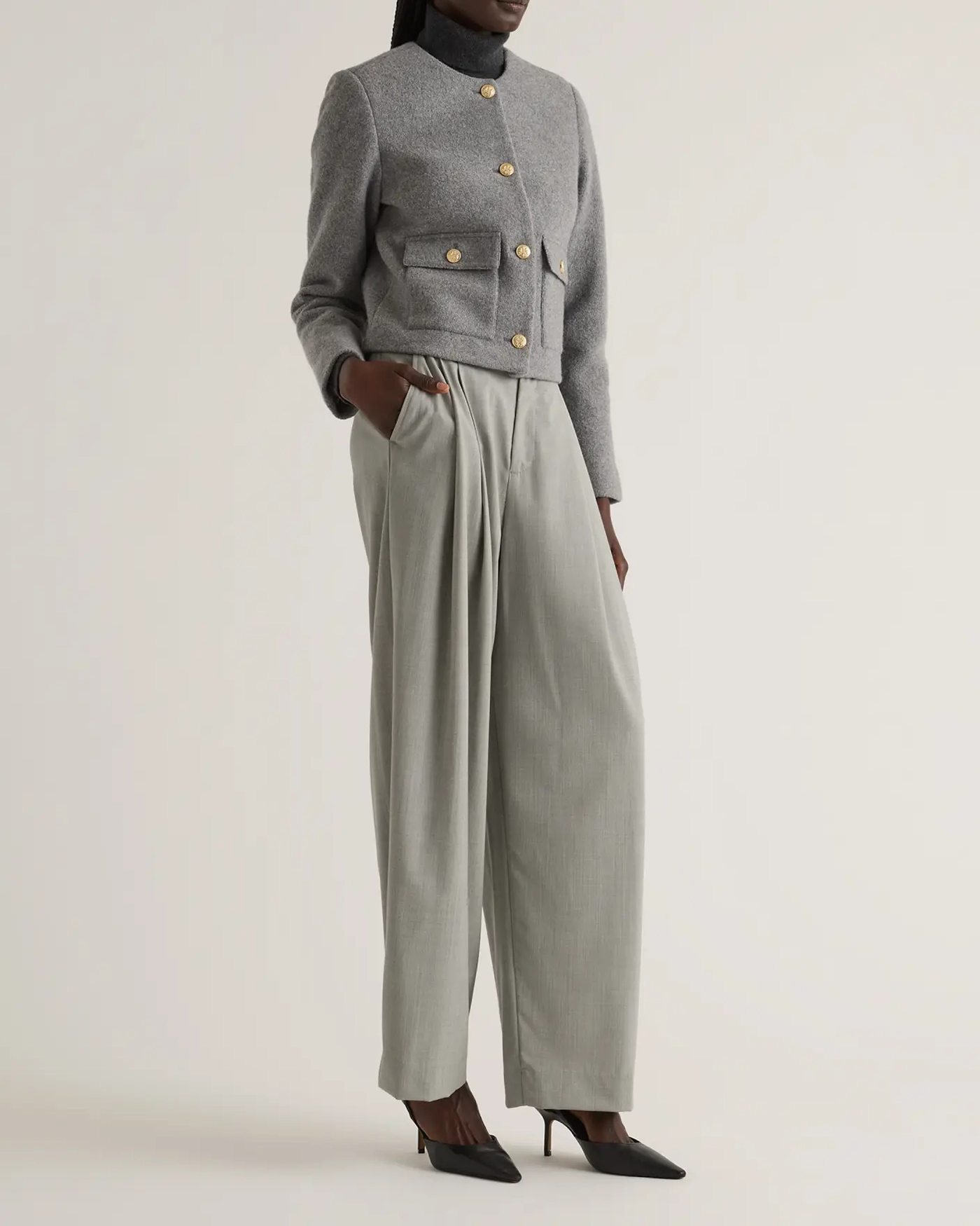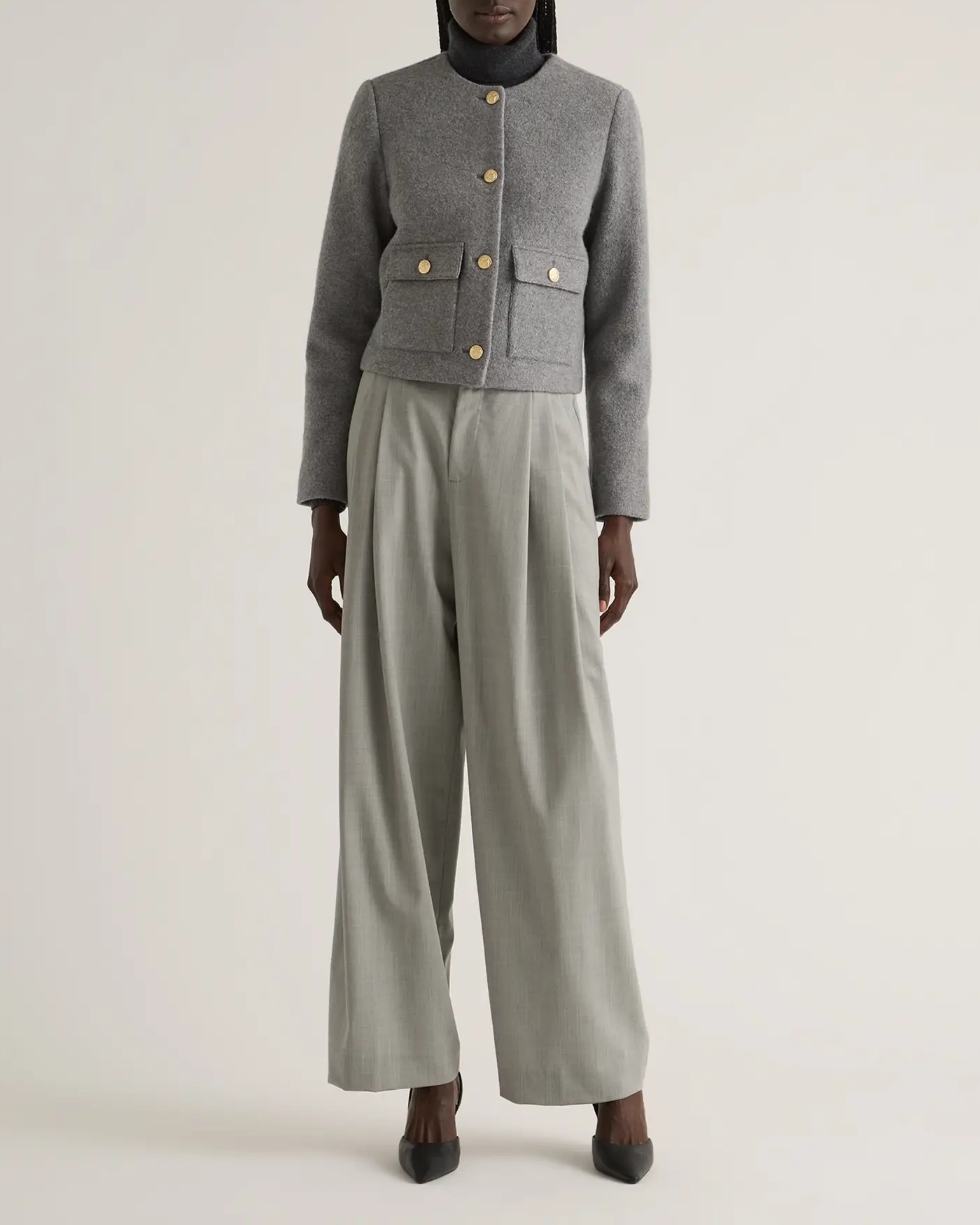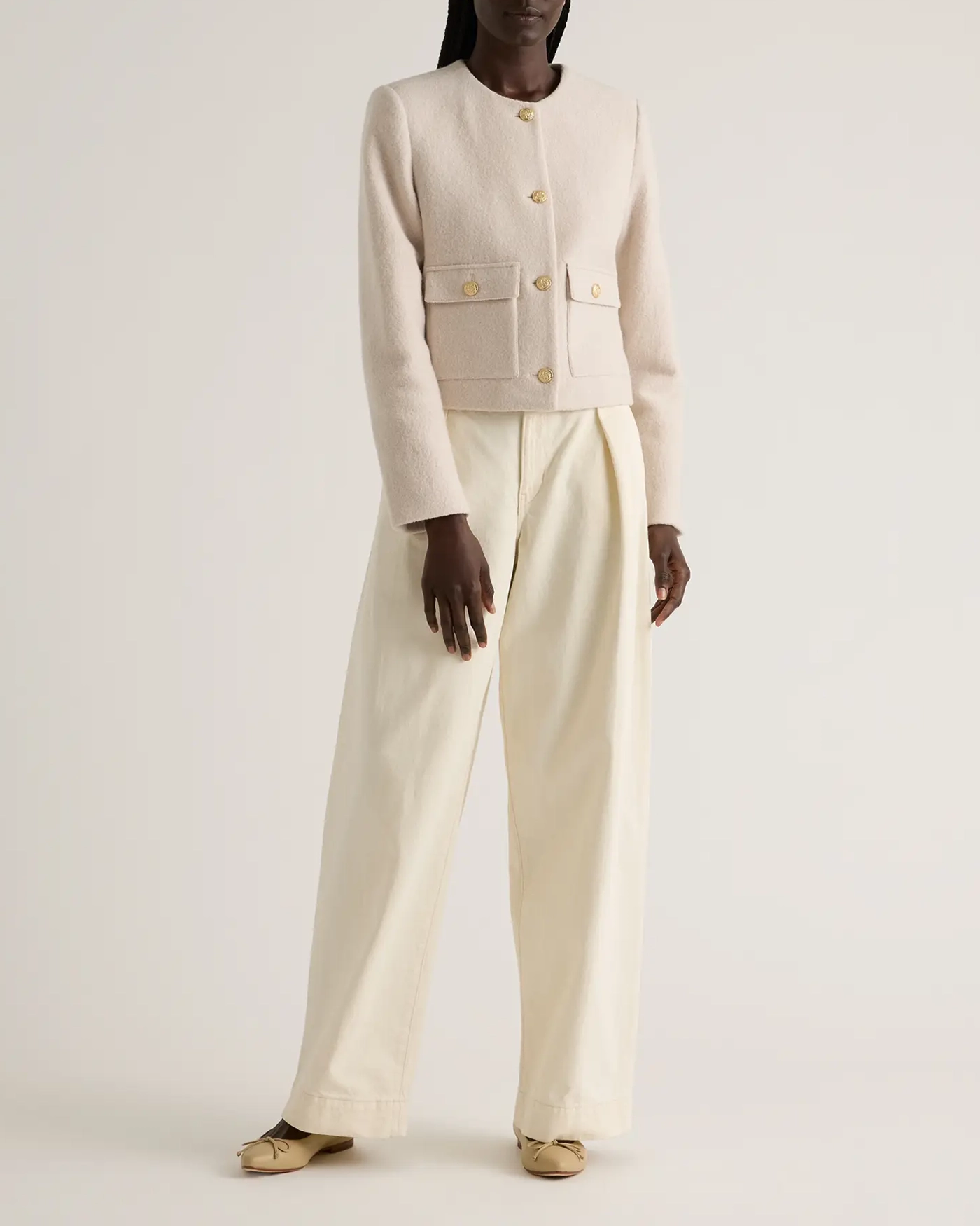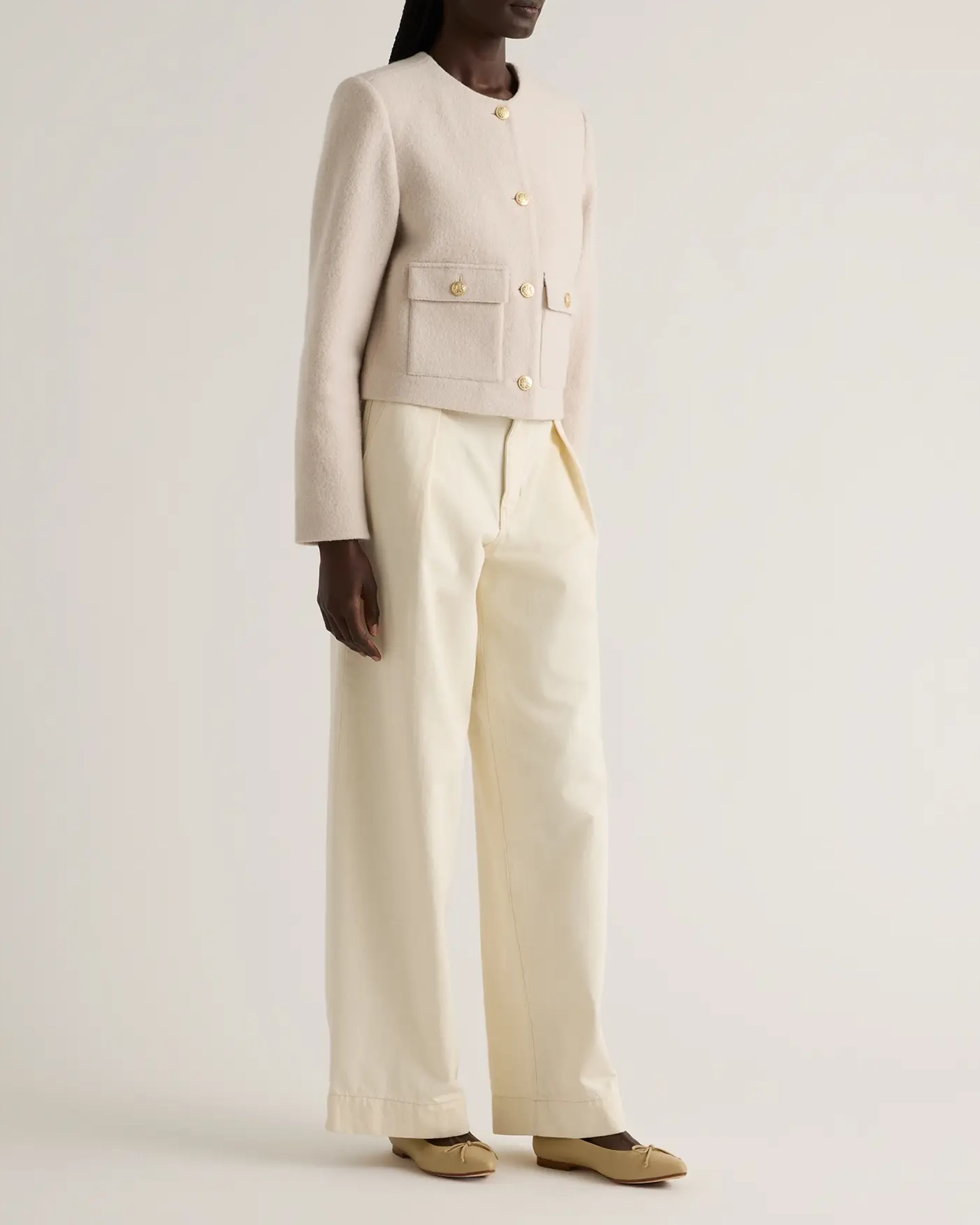 Elevate your wardrobe with this sophisticated 100% Merino Wool Collarless Cropped Jacket. Made from gorgeously textured merino wool, this jacket brings both softness and warmth. The collarless design brings a sleek, minimalist silhouette that adds a refined touch to any outfit, perfect for layering over blouses or dresses. The cropped cut enhances the feminine shape, sitting perfectly at the waistline for a flattering fit.