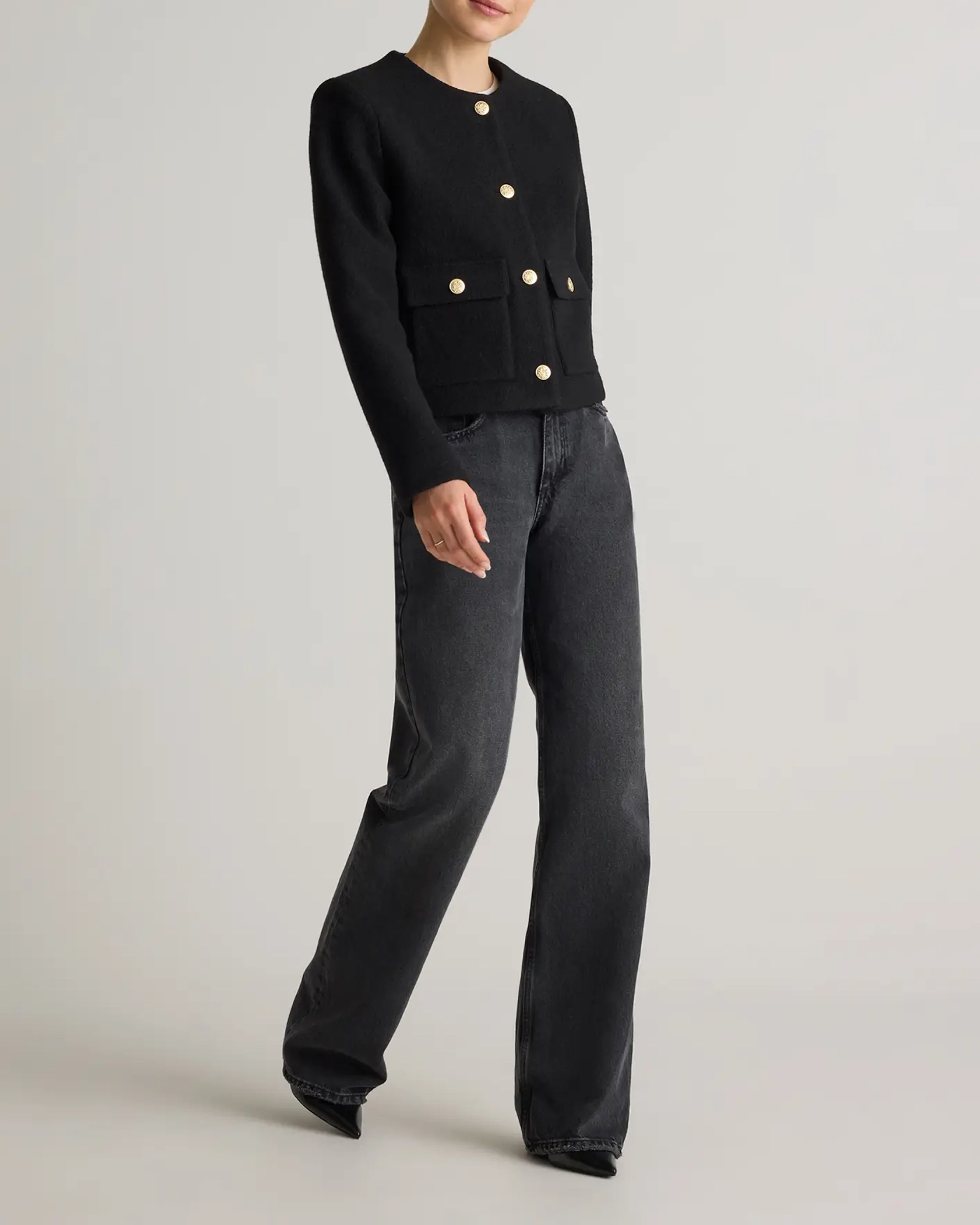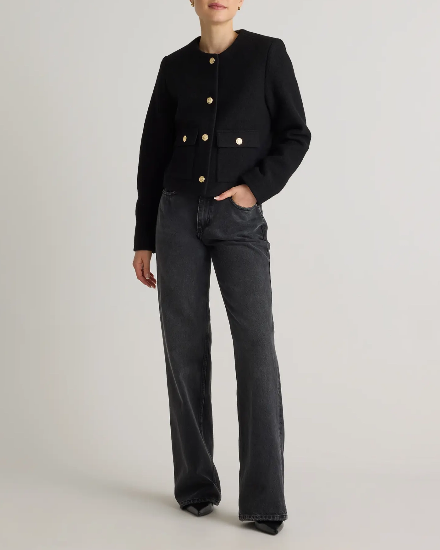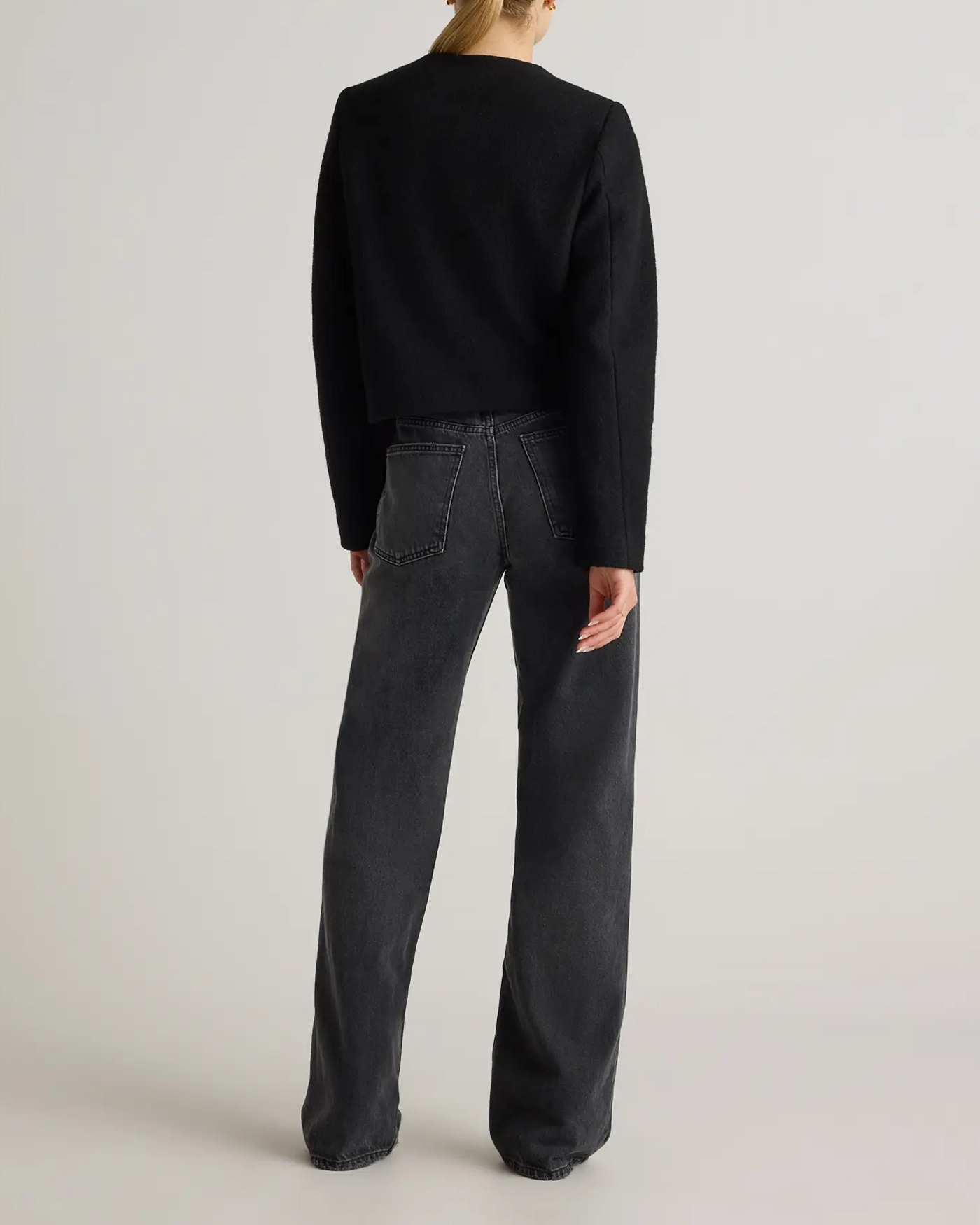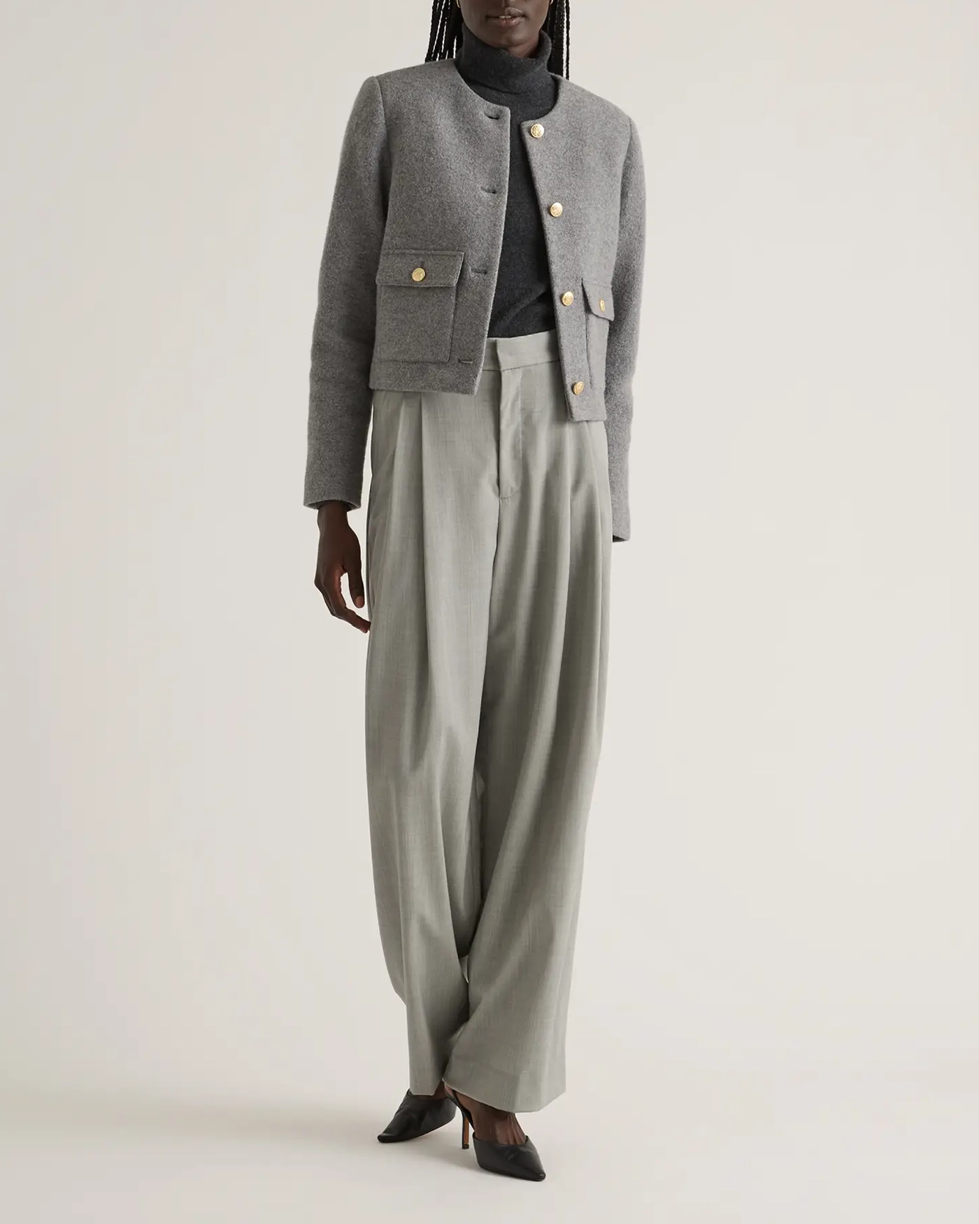 Elevate your wardrobe with this sophisticated 100% Merino Wool Collarless Cropped Jacket. Made from gorgeously textured merino wool, this jacket brings both softness and warmth. The collarless design brings a sleek, minimalist silhouette that adds a refined touch to any outfit, perfect for layering over blouses or dresses. The cropped cut enhances the feminine shape, sitting perfectly at the waistline for a flattering fit.