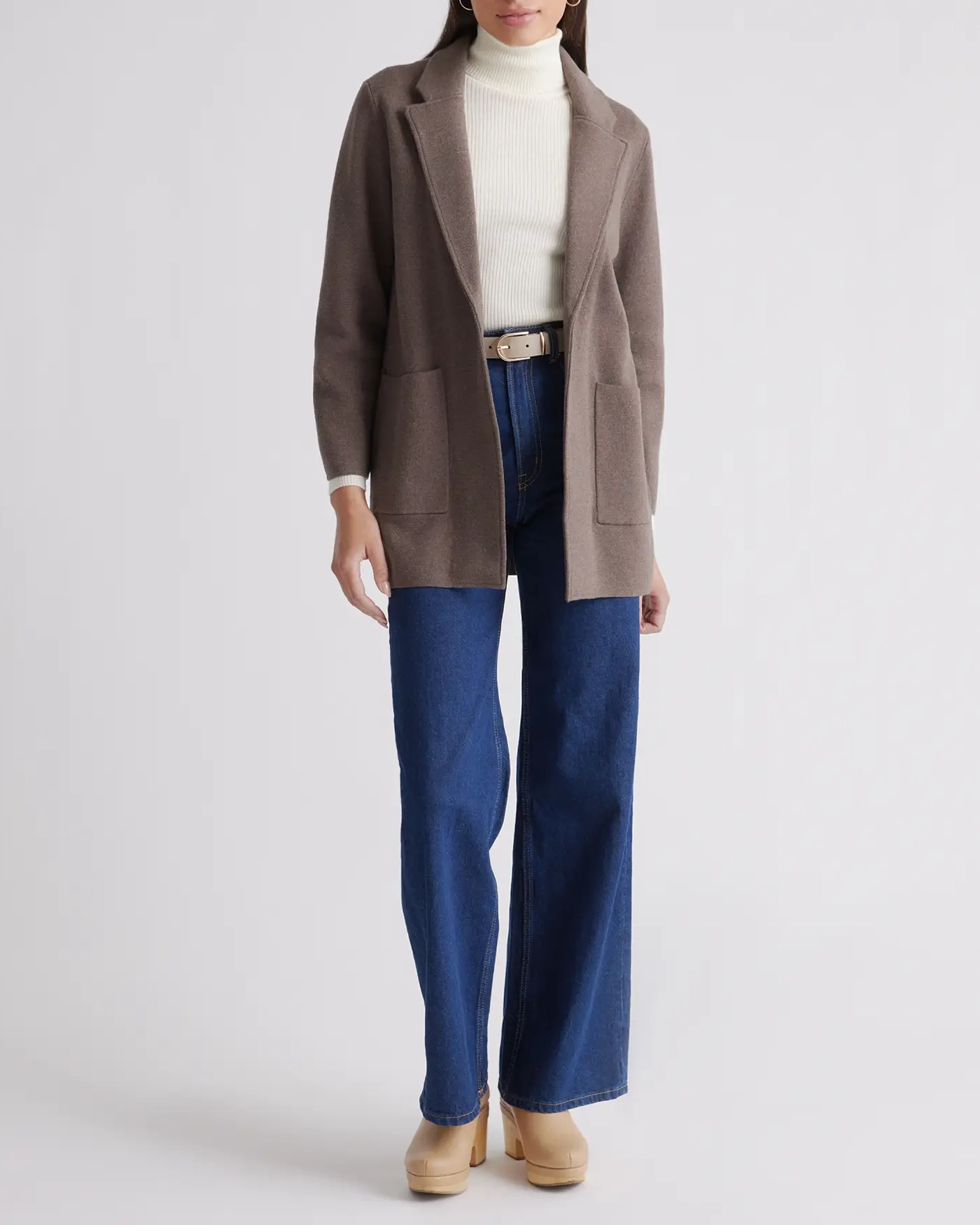 Layer up and level up. We present to you: the knit blazer. This 100% organic cotton blazer is a great addition to throw on for a slightly more formal look without the usual stiff blazer feeling. With a polished lapel, two patch pockets, and bracelet-length sleeves it's giving CEO vibes, but effortless.
