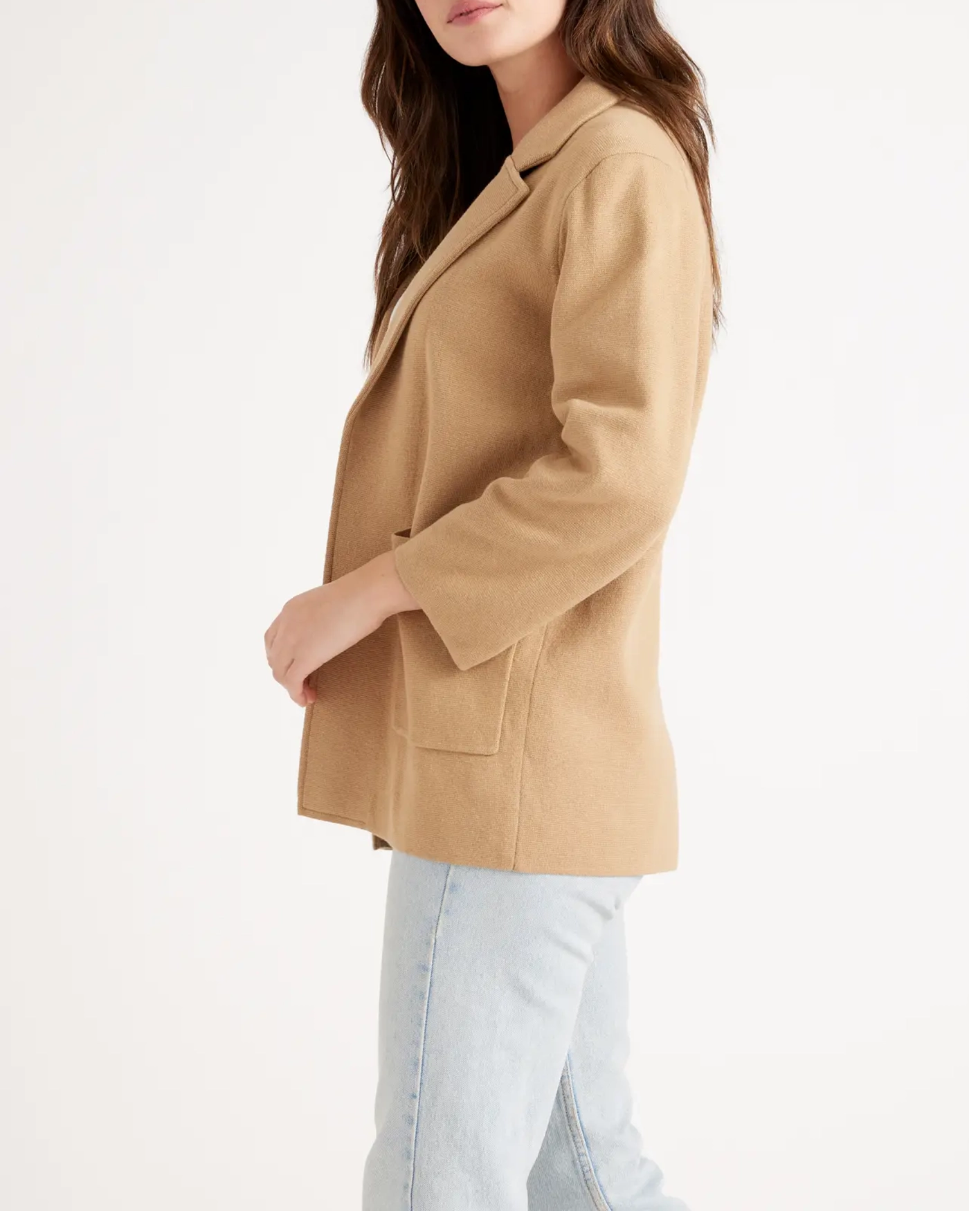 Layer up and level up. We present to you: the knit blazer. This 100% organic cotton blazer is a great addition to throw on for a slightly more formal look without the usual stiff blazer feeling. With a polished lapel, two patch pockets, and bracelet-length sleeves it's giving CEO vibes, but effortless.