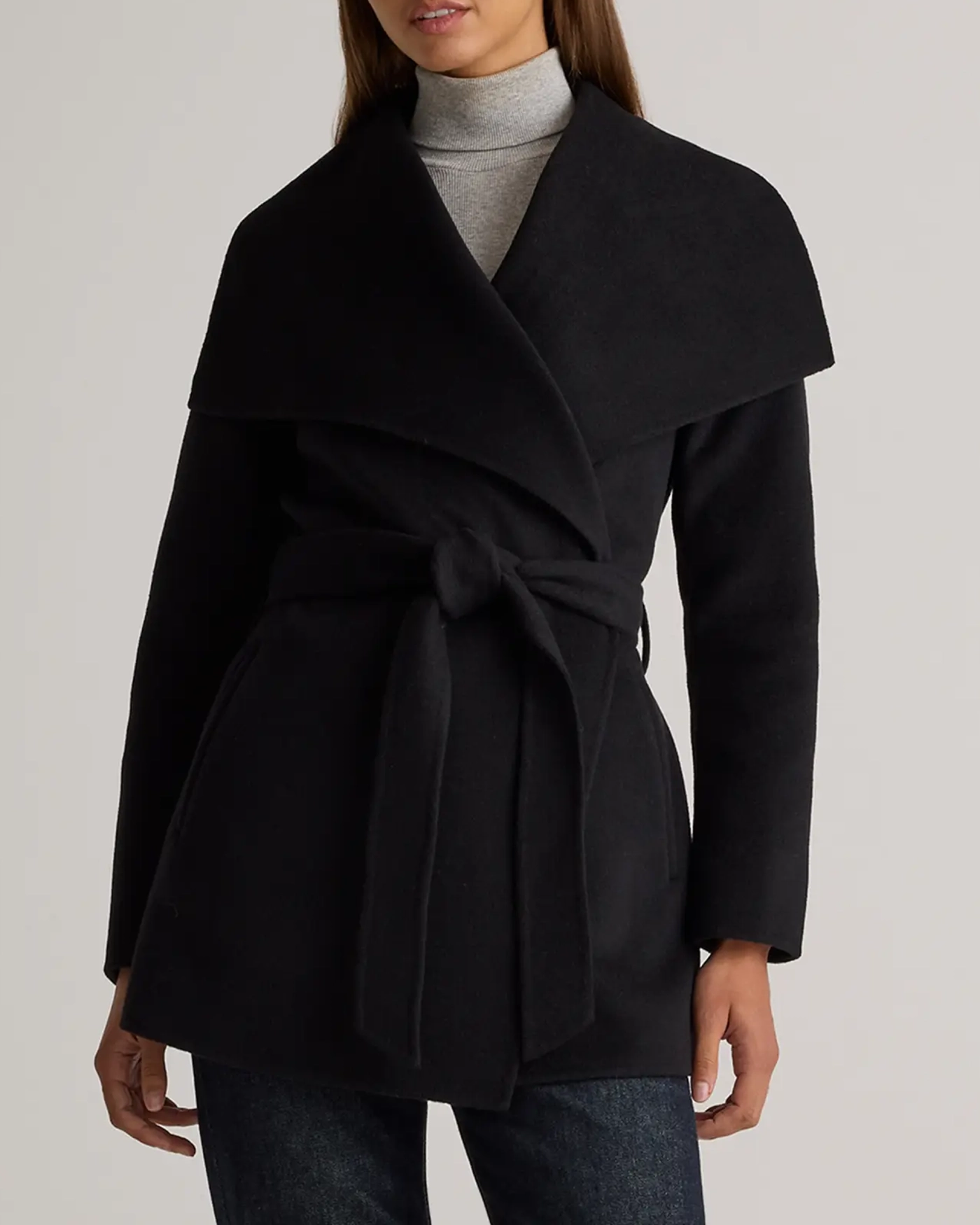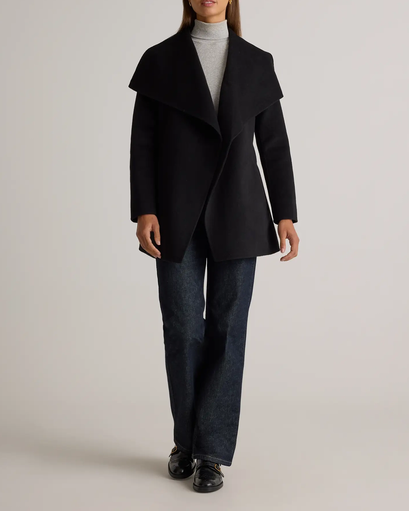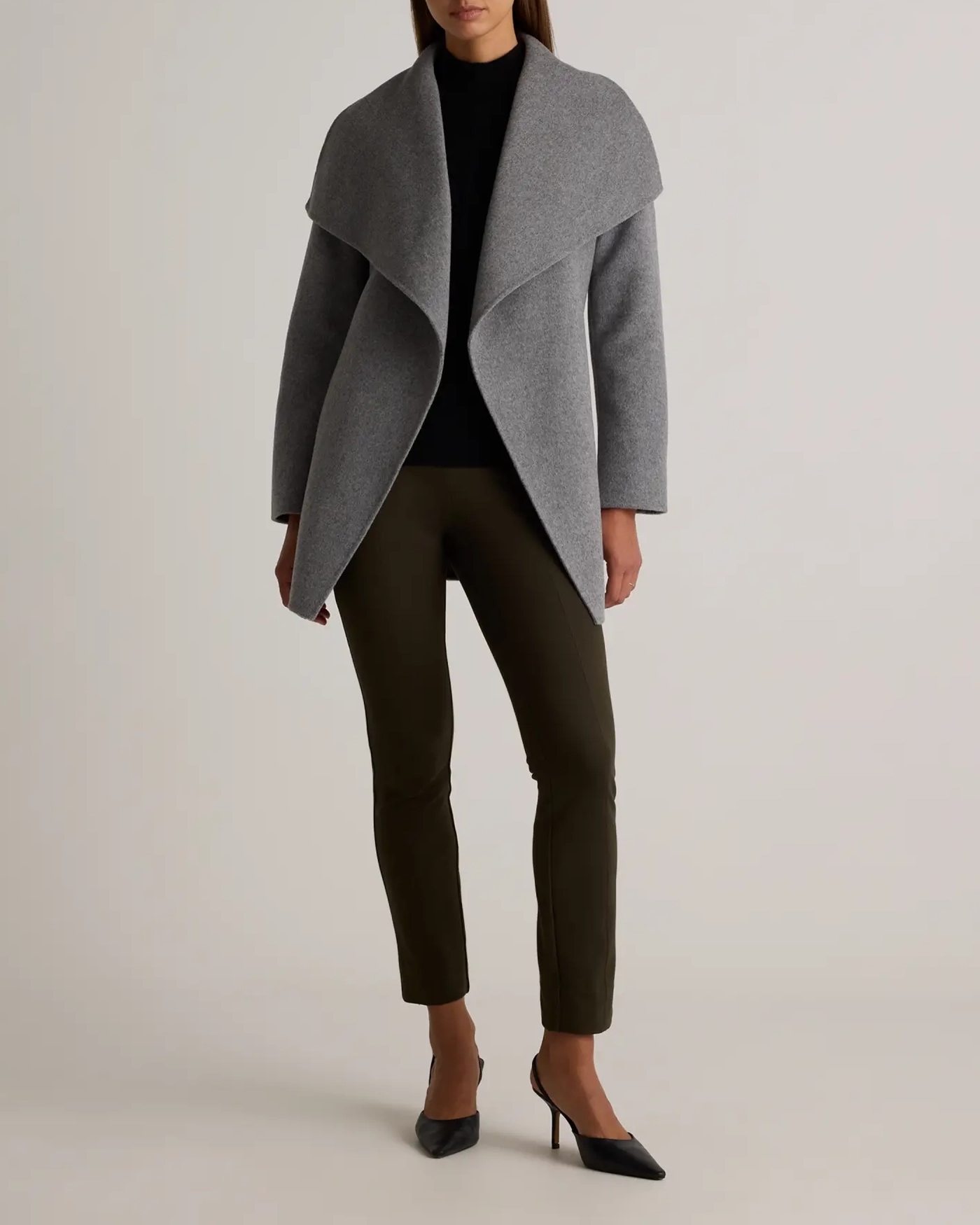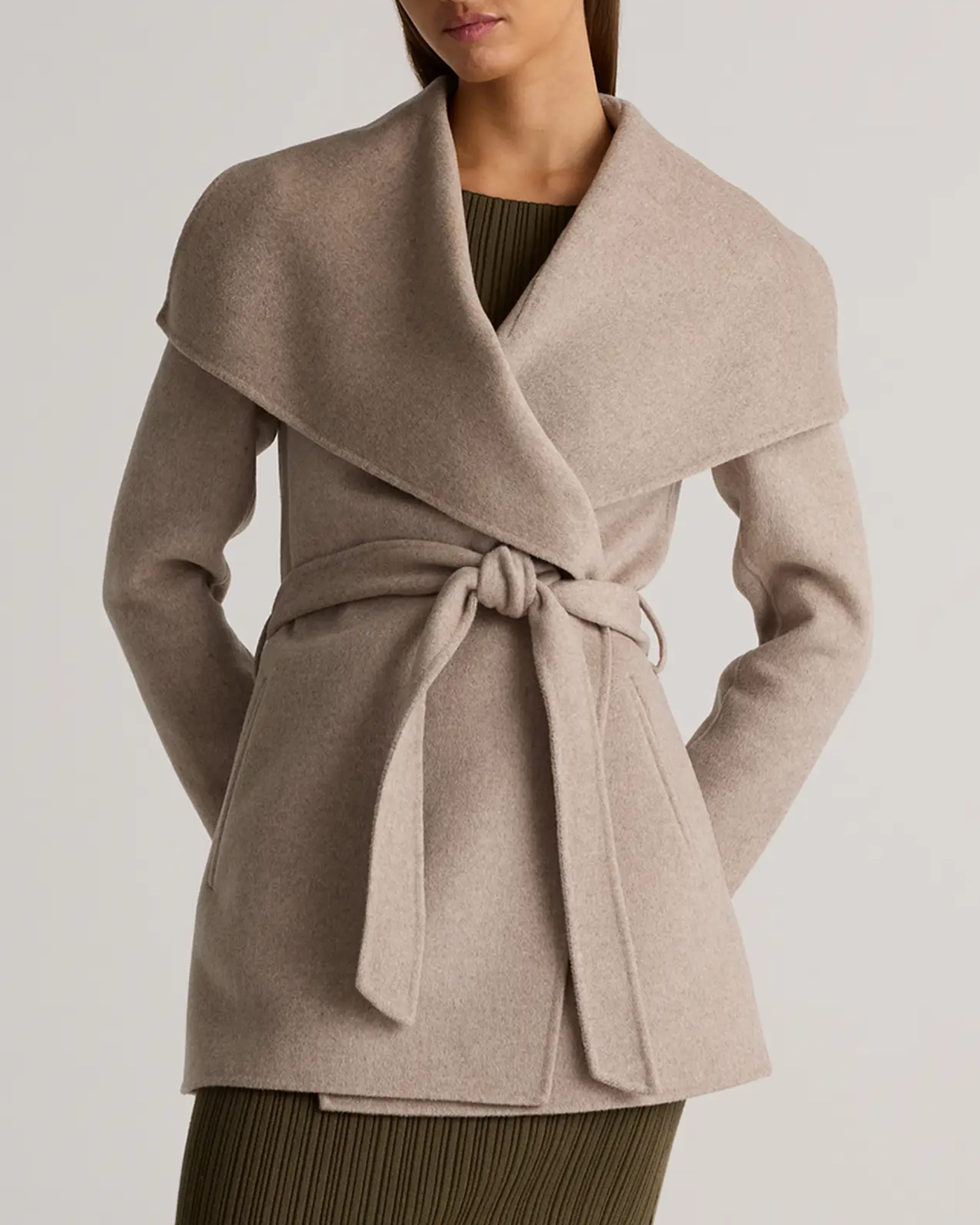 Elevate your outerwear game with our Double-Faced Merino Wool Draped Collar Short Wrap Coat. This short wrap coat features a flattering waist belt to cinch your silhouette and an elegant draped collar that enhances its sleek look. Its shorter length makes it ideal for pairing with everything from jeans to dresses, offering endless styling possibilities while keeping you cozy. With its clean lines and timeless design, this coat is destined to become a staple in your wardrobe.