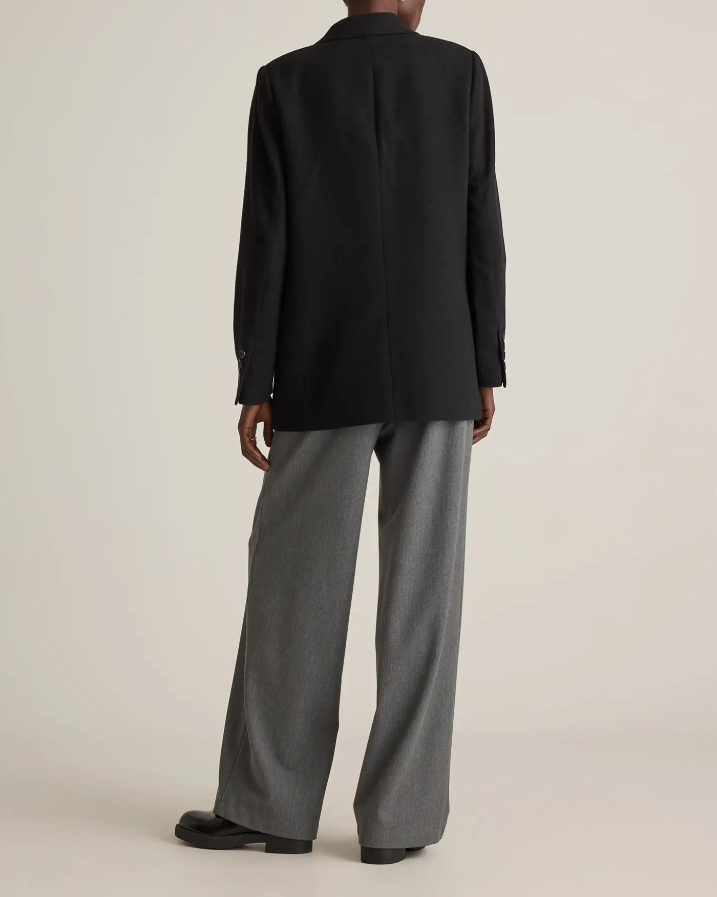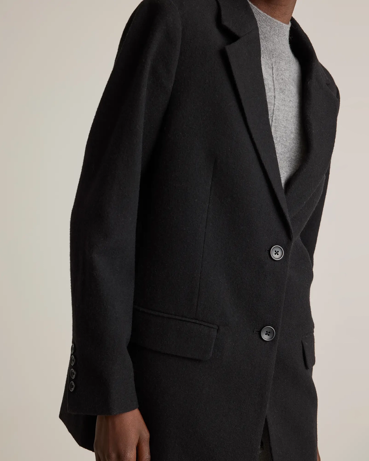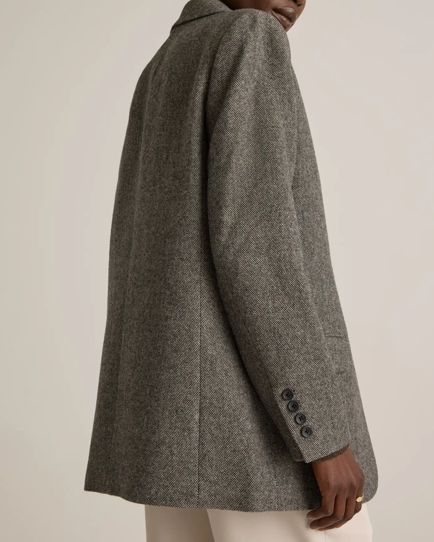 Permission to upgrade, granted. Reimagine your next ensemble with our Italian Wool Oversized Blazer. Made from recycled Italian wool, this blazer boasts a cool drape and serious warmth. You'll love the cuff buttons, practical flap pockets, and classic notched lapels. Elevate your style effortlessly with this timeless look.
