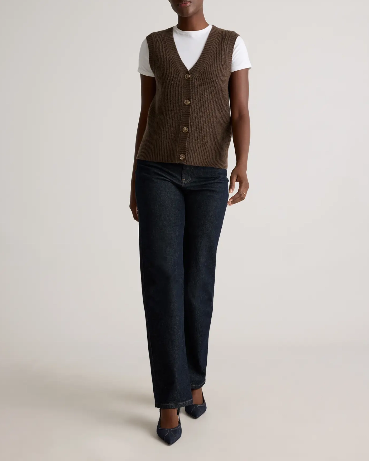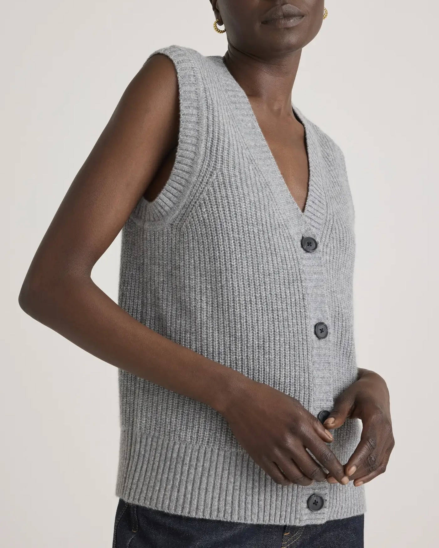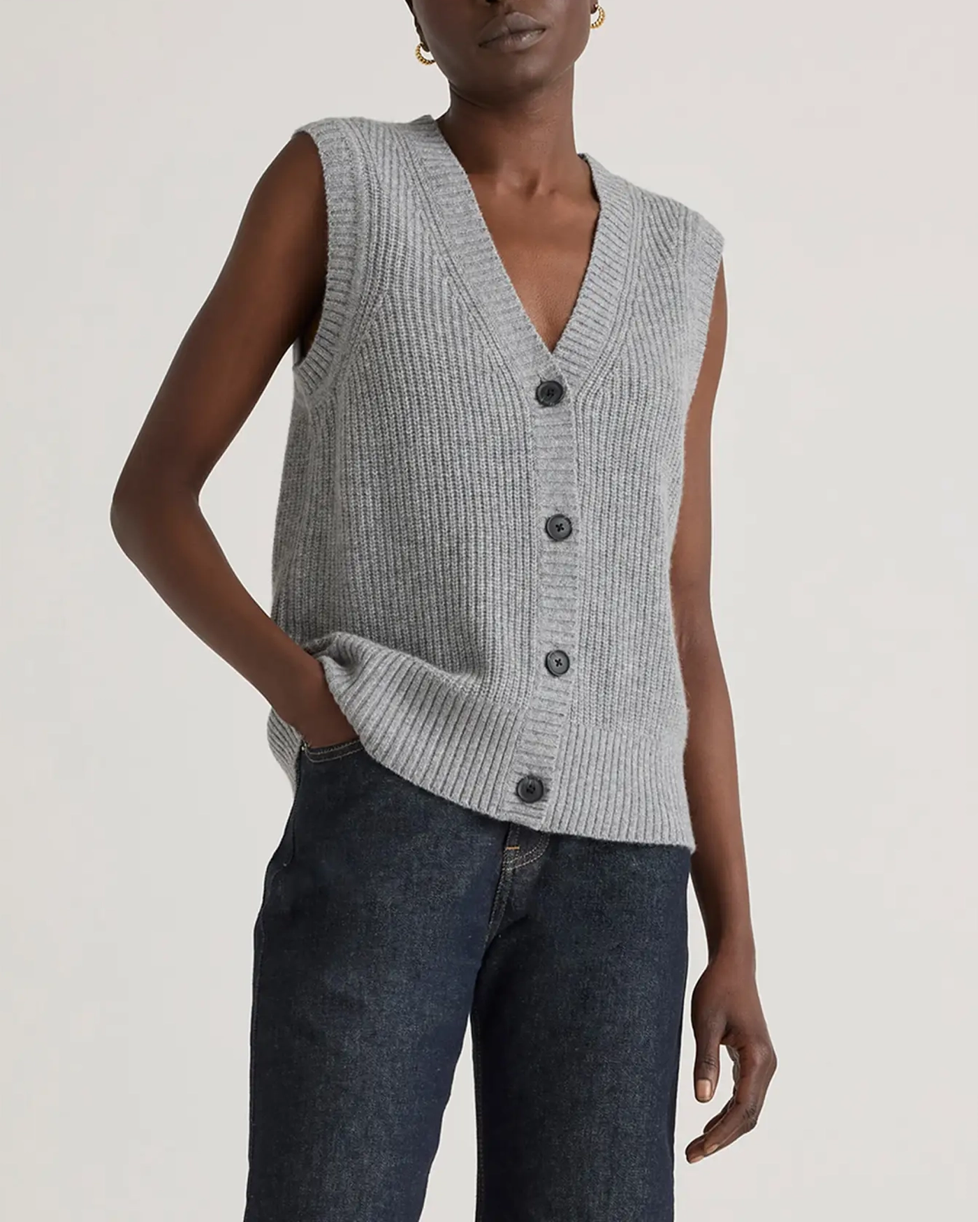 Say yes to sweater vests in 100% Grade-A Mongolian cashmere. This fresh take on a fisherman sweater comes complete with allover ribbed detailing and classic buttons. Wear it as a standalone or over a cami for a luxuriously soft layering piece. It’s the cozy-chic transitional top you’ll want to wear with everything.