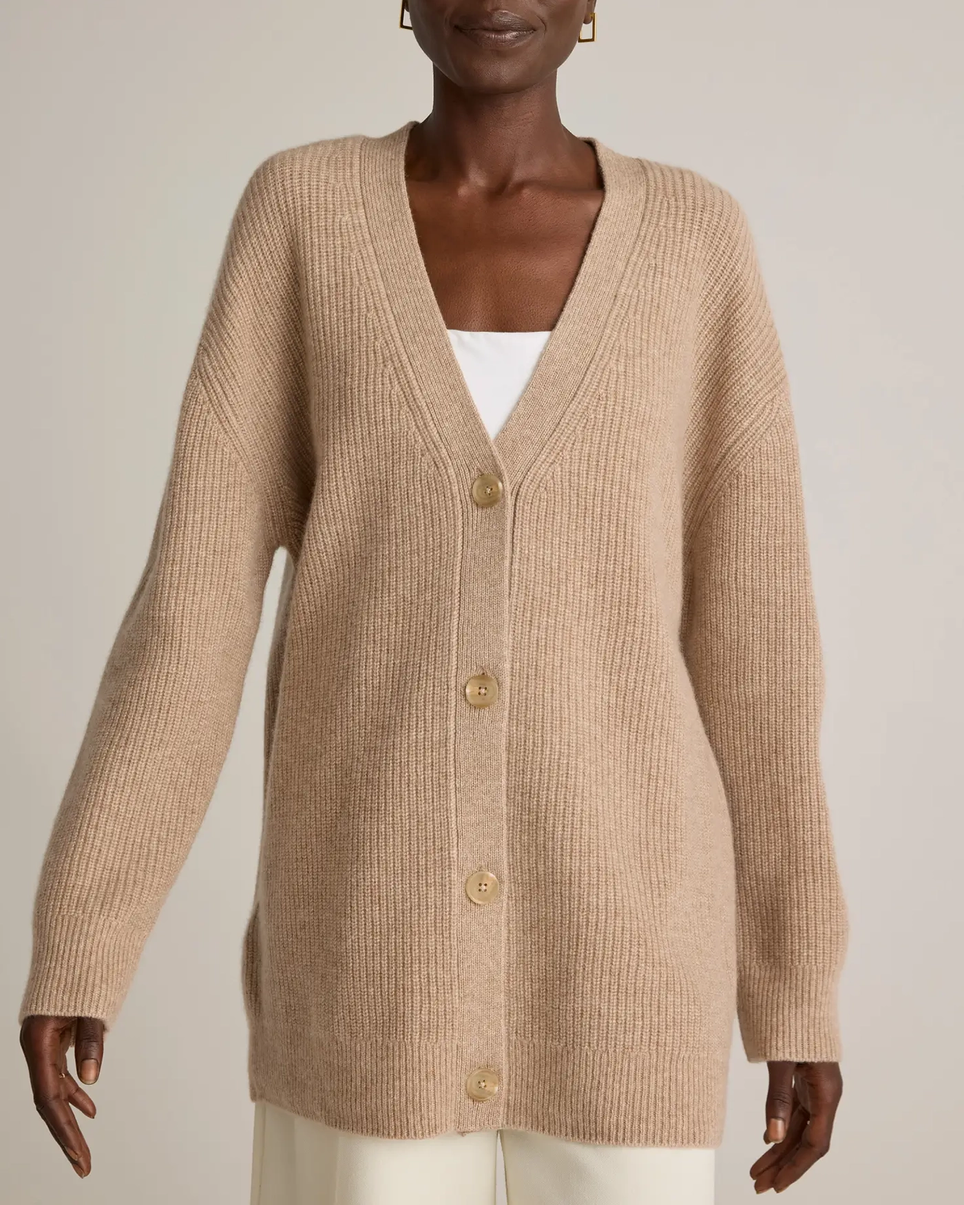 Our cashmere boyfriend cardigan perfectly blends comfort and style. Crafted from irresistibly soft Grade-A Mongolian cashmere, it's now smoother, more durable, and more substantial than ever. We've refined the fit to be true to size, thanks to your feedback. With allover fisherman rib detailing, it brings a subtle coastal charm.