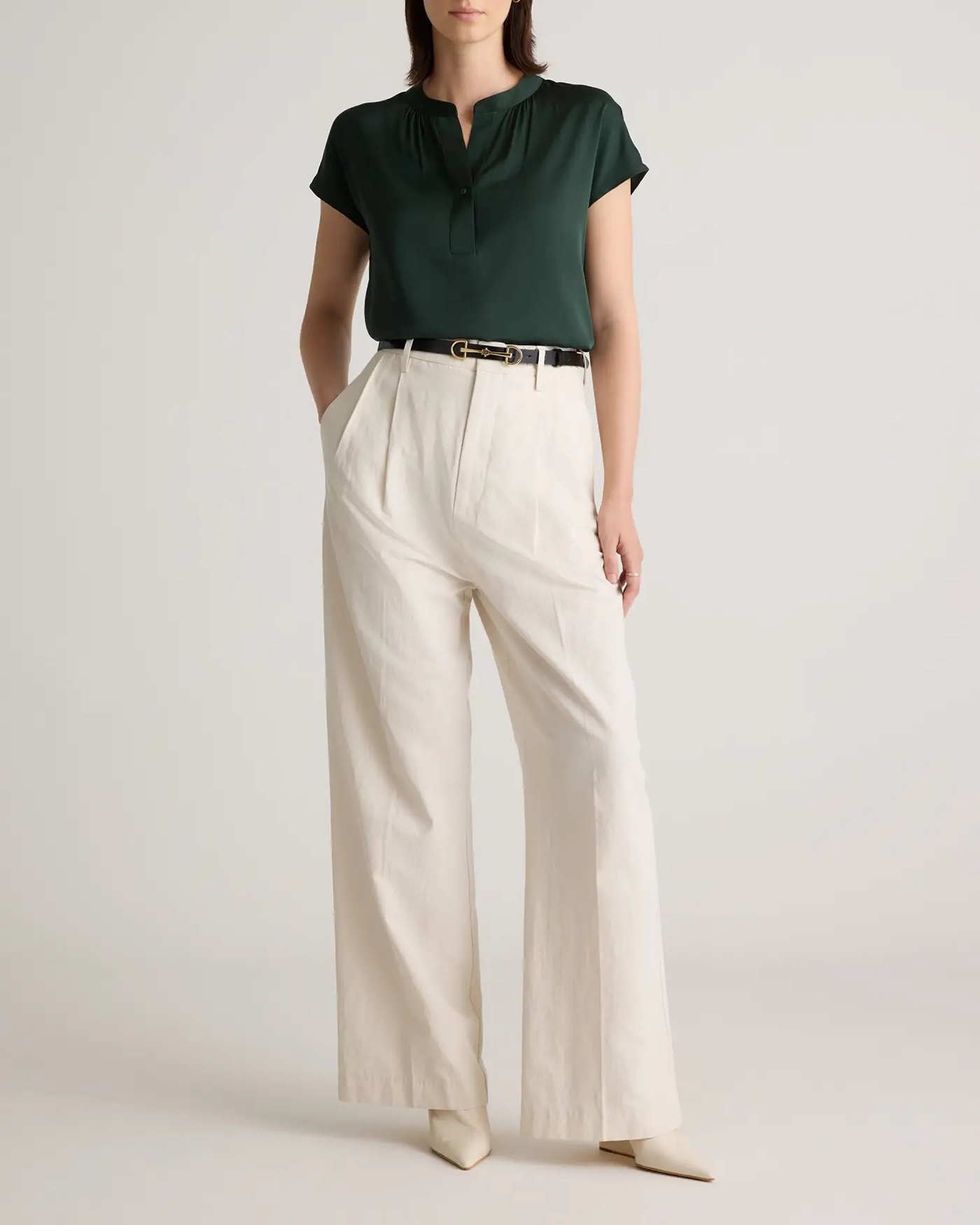 - Pleat detail at neckline